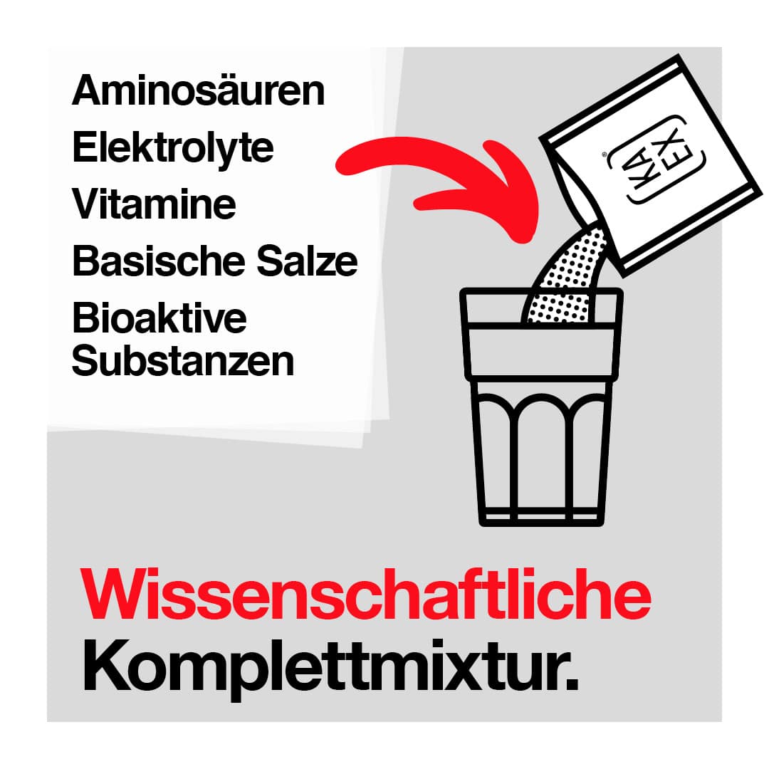 Zutaten Getränk: Wasser, essentielle Aminosäuren (L-Histidin, L-Isoleucin, L-Leucin, L-Lysin, L-Methio-nin, L-Phenylalanin, L-Threonin, L-Tryptophan, L-Valin), Natriumcitrat, Bio-Rübenwurzelextrakt (Rote Beete Extrakt), Magnesiumcitrat, Kalzium-citrat, Kaliumcitrat, Koffein, Säuerungsmittel (Äpfelsäure, Zitronensäure), natürliche Aromen, Konservierungsstoffe (Kaliumsorbat, Natriumbenzoat), Süssungsmittel (Sucralose) und Schwarzer Pfefferextrakt (Bioperine®).